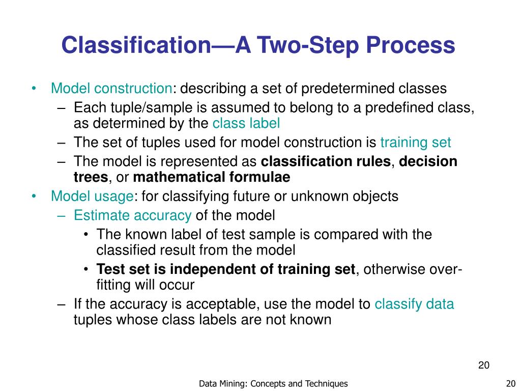 Classification—A Two-Step Process Model construction: describing a set of predetermined classes Each tuple/sample is assumed to belong to a predefined class, as determined by the class label The set of tuples used for model construction is training set The model is represented as classification rules, decision trees, or mathematical formulae Model usage: for classifying future or unknown objects Estimate accuracy of the model The known label of test sample is compared with the classified result from the model Test set is independent of training set, otherwise over-fitting will occur If the accuracy is acceptable, use the model to classify data tuples whose class labels are not known Data Mining: Concepts and Techniques 20