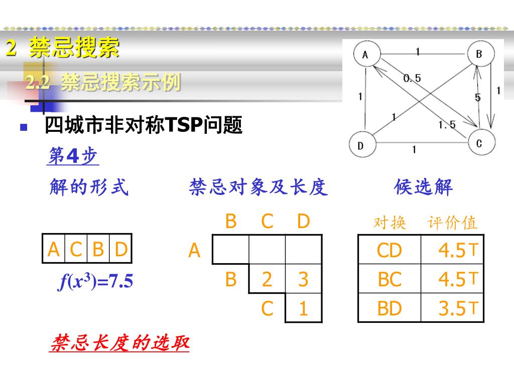 2.2 禁忌搜索示例 • 四城市非对称TSP问题 第4步 解的形式 禁忌对象及长度 候选解 f(x3)=7.5 禁忌长度的选取 2 禁忌搜索 T T T