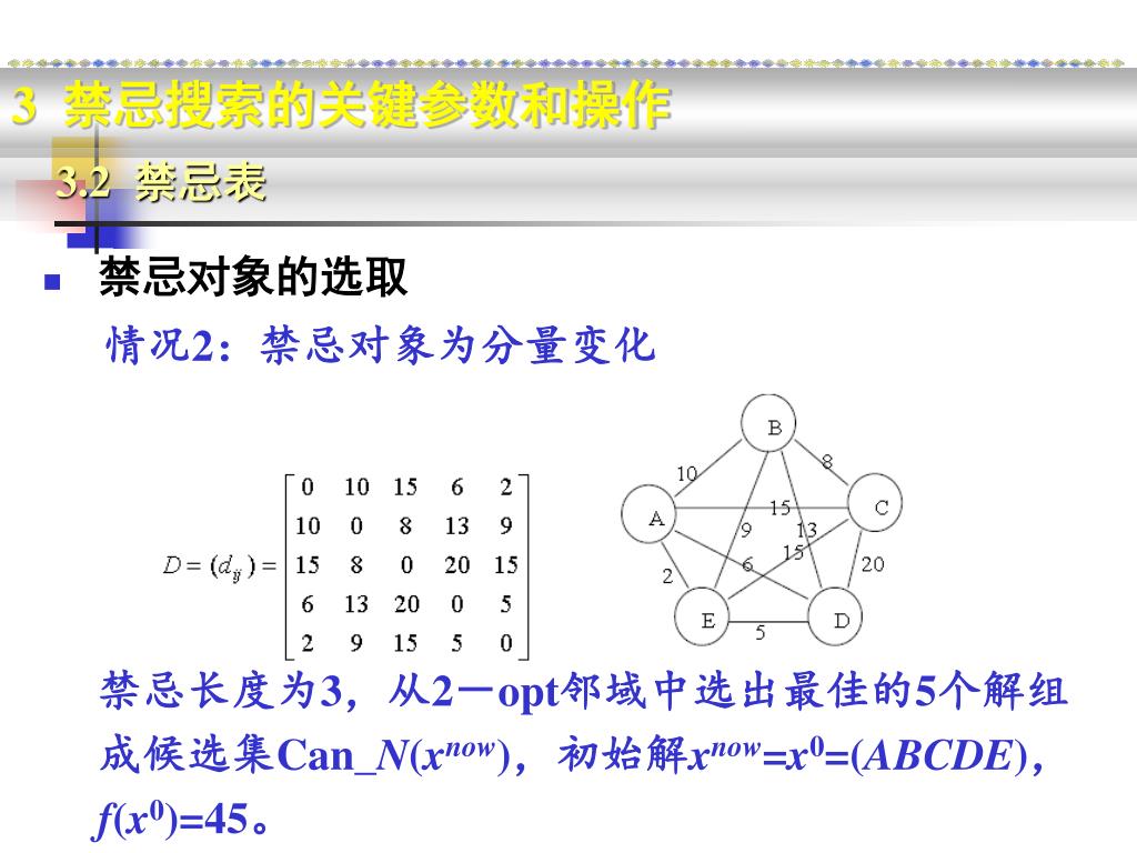 3.2 禁忌表 • 禁忌对象的选取 情况2:禁忌对象为分量变化 禁忌长度为3,从2-opt邻域中选出最佳的5个解组成候选集Can_N(xnow),初始解xnow=x0=(ABCDE),f(x0)=45。 3 禁忌搜索的关键参数和操作