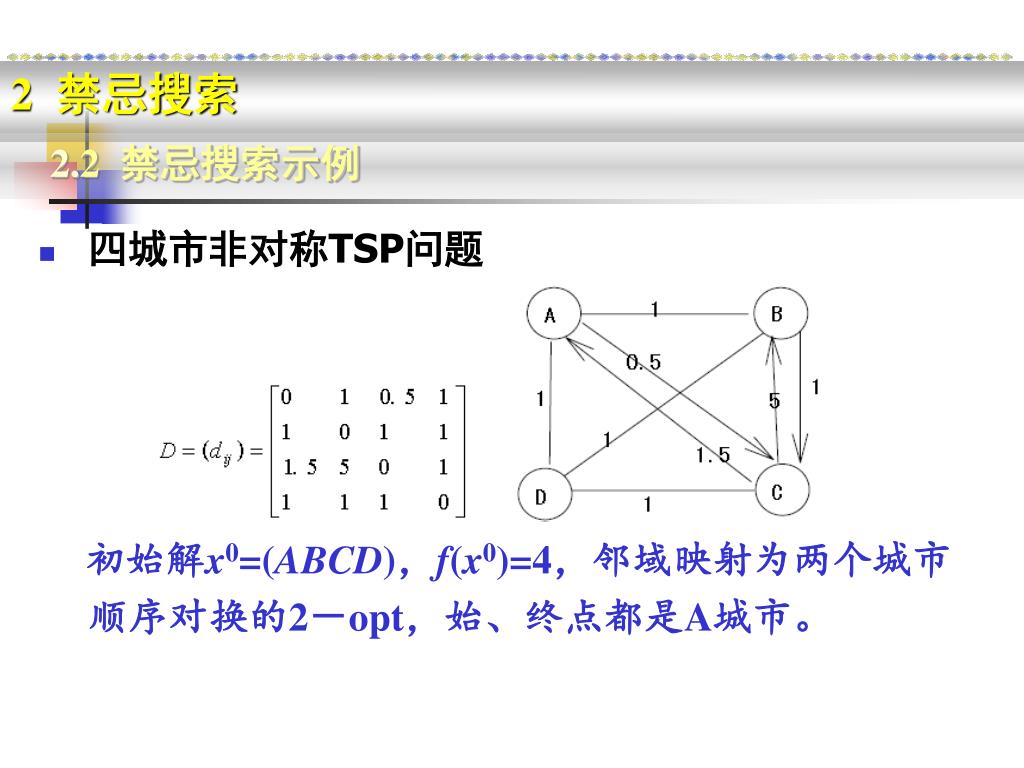 2.2 禁忌搜索示例 • 四城市非对称TSP问题 初始解x0=(ABCD),f(x0)=4,邻域映射为两个城市顺序对换的2-opt,始、终点都是A城市。 2 禁忌搜索