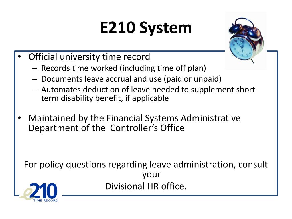 E210 System • Official university time record • Records time worked (including time off plan) • Documents leave accrual and use (paid or unpaid) • Automates deduction of leave needed to supplement short-term disability benefit, if applicable • Maintained by the Financial Systems Administrative Department of the Controller’s Office For policy questions regarding leave administration, consult your Divisional HR office.