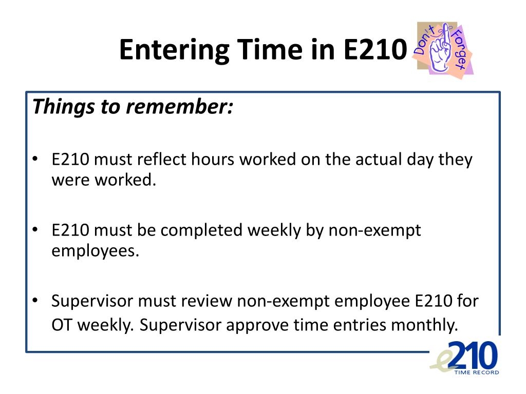 Entering Time in E210 Things to remember: • E210 must reflect hours worked on the actual day they were worked. • E210 must be completed weekly by non-exempt employees. • Supervisor must review non-exempt employee E210 for OT weekly.Supervisor approve time entries monthly.