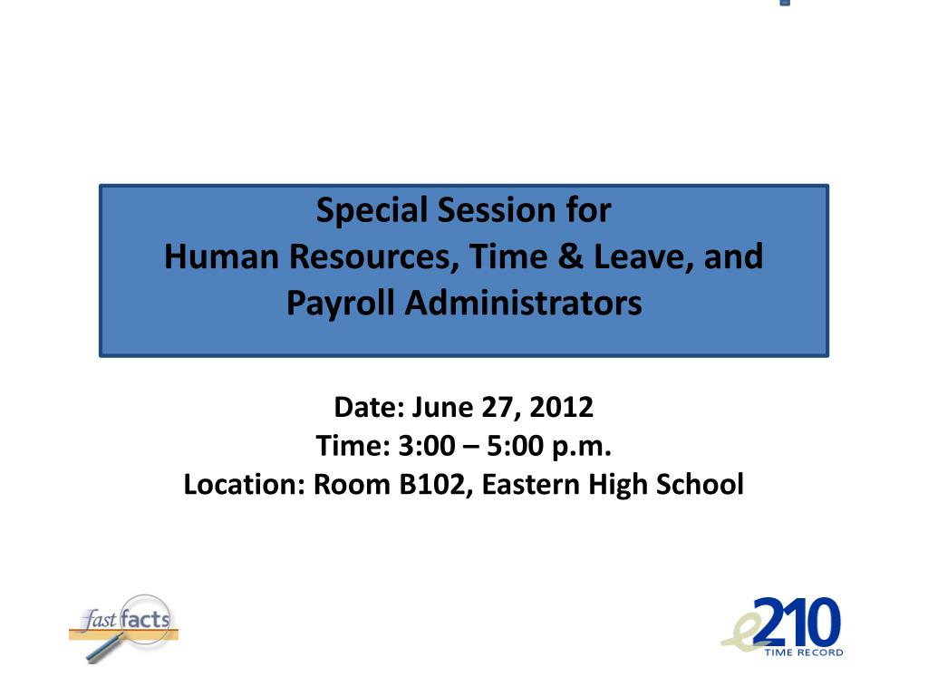 Special Session forHuman Resources, Time & Leave, and Payroll AdministratorsDate: June 27, 2012Time: 3:00 – 5:00 p.m.Location: Room B102, Eastern High School