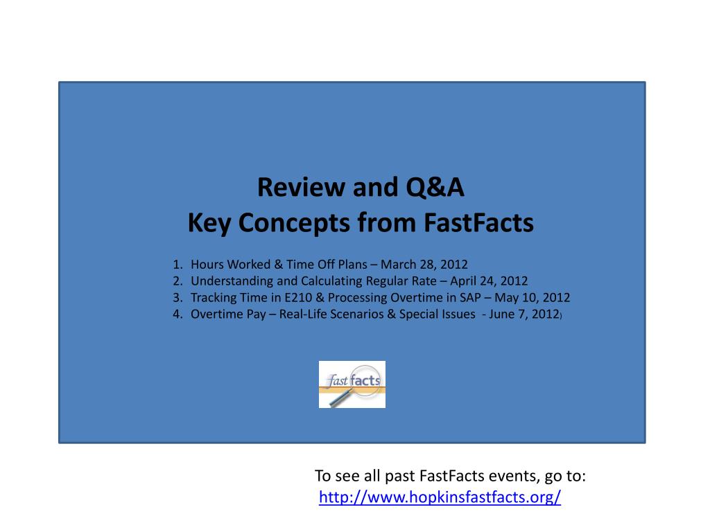 Review and Q&A Key Concepts from FastFacts Hours Worked & Time Off Plans – March 28, 2012 Understanding and Calculating Regular Rate – April 24, 2012 Tracking Time in E210 & Processing Overtime in SAP – May 10, 2012 Overtime Pay – Real-Life Scenarios & Special Issues - June 7, 2012) To see all past FastFacts events, go to:http://www.hopkinsfastfacts.org/