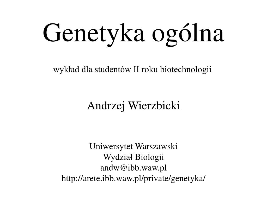 Genetyka ogólna wykład dla studentów II roku biotechnologii Andrzej Wierzbicki Uniwersytet Warszawski Wydział Biologii andw@ibb.waw.pl http://arete.ibb.waw.pl/private/genetyka/