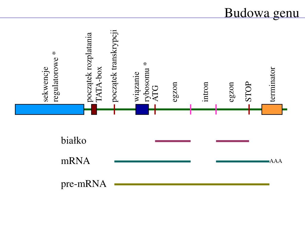 Budowa genu początek rozplatania TATA-box początek transkrypcji sekwencje regulatorowe * wiązanie rybosomu * terminator STOP intron egzon egzon ATG białko mRNA AAA pre-mRNA