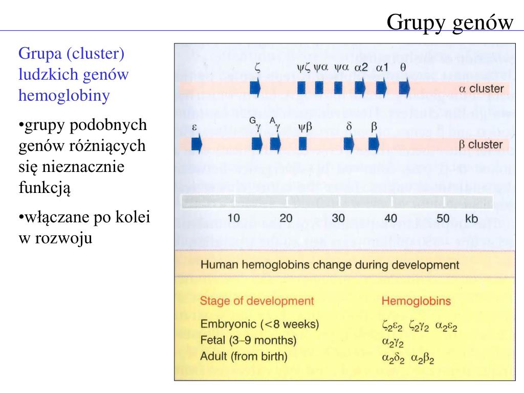 Grupy genów • Grupa (cluster) ludzkich genów hemoglobiny • grupy podobnych genów różniących się nieznacznie funkcją • włączane po kolei w rozwoju