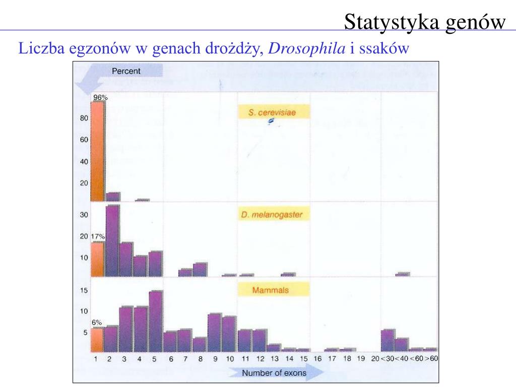 Statystyka genów Liczba egzonów w genach drożdży, Drosophila i ssaków