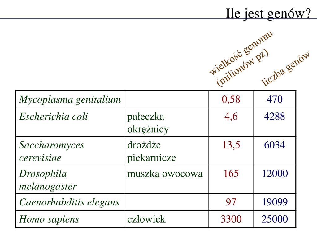 Ile jest genów? wielkość genomu (milionów pz) liczba genów