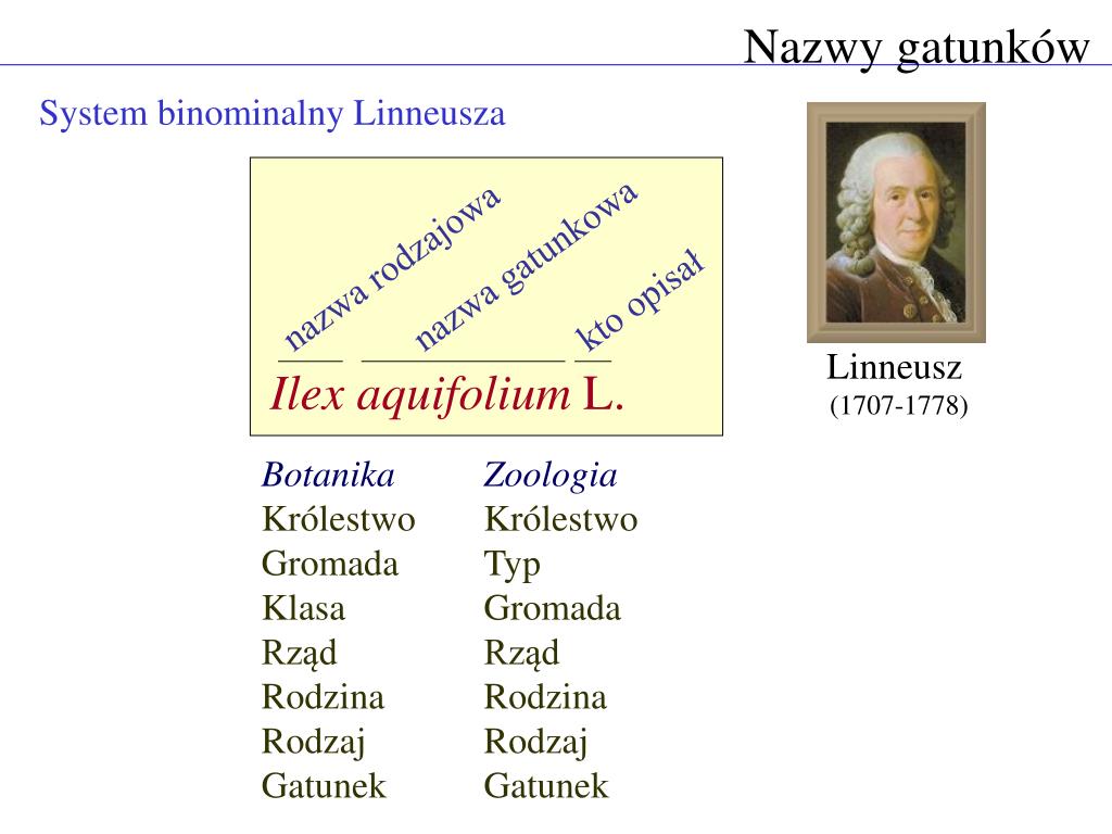 nazwa gatunkowa nazwa rodzajowa kto opisał Ilex aquifolium L. Nazwy gatunków • System binominalny Linneusza Linneusz (1707-1778) Botanika Zoologia Królestwo Królestwo Gromada Typ Klasa Gromada Rząd Rząd Rodzina Rodzina Rodzaj Rodzaj Gatunek Gatunek