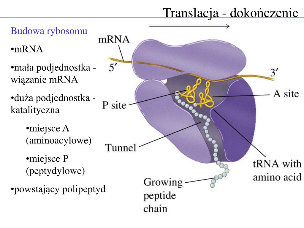 Translacja - dokończenie • Budowa rybosomu • mRNA • mała podjednostka - wiązanie mRNA • duża podjednostka - katalityczna • miejsce A (aminoacylowe) • miejsce P (peptydylowe) • powstający polipeptyd