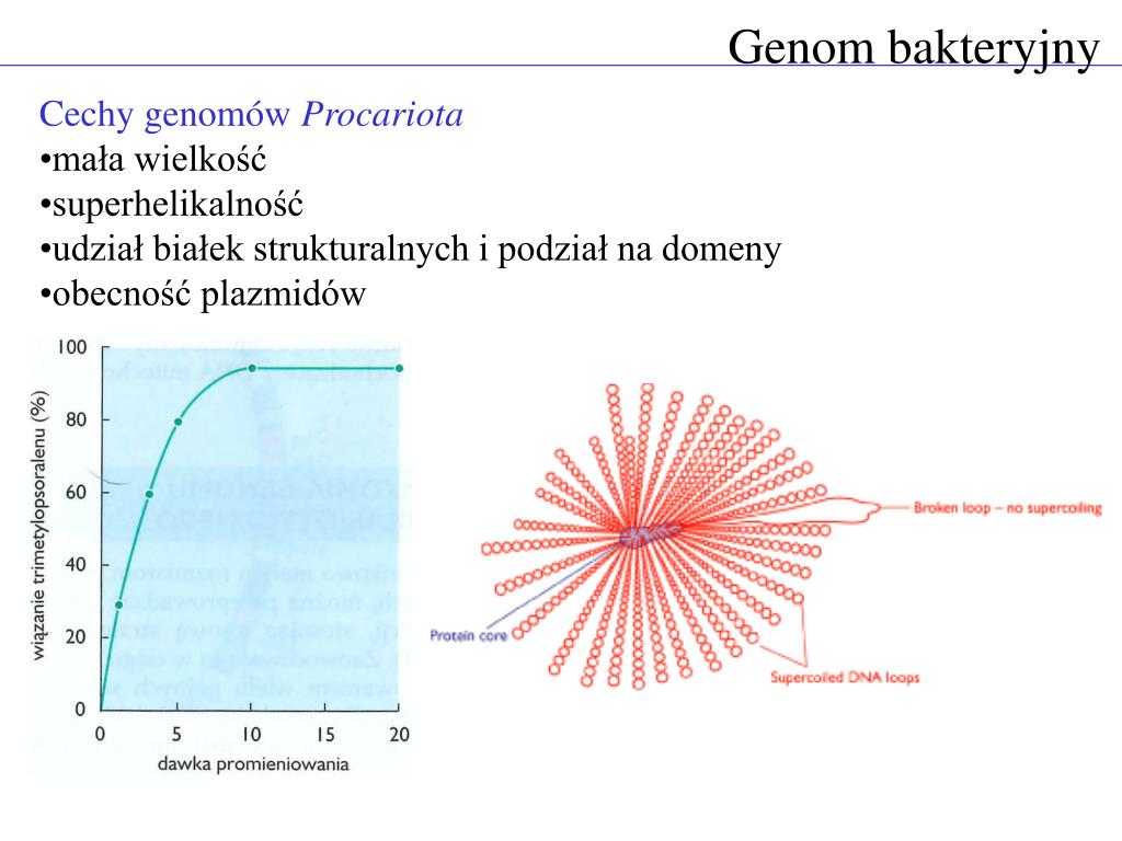 Genom bakteryjny • Cechy genomów Procariota • mała wielkość • superhelikalność • udział białek strukturalnych i podział na domeny • obecność plazmidów