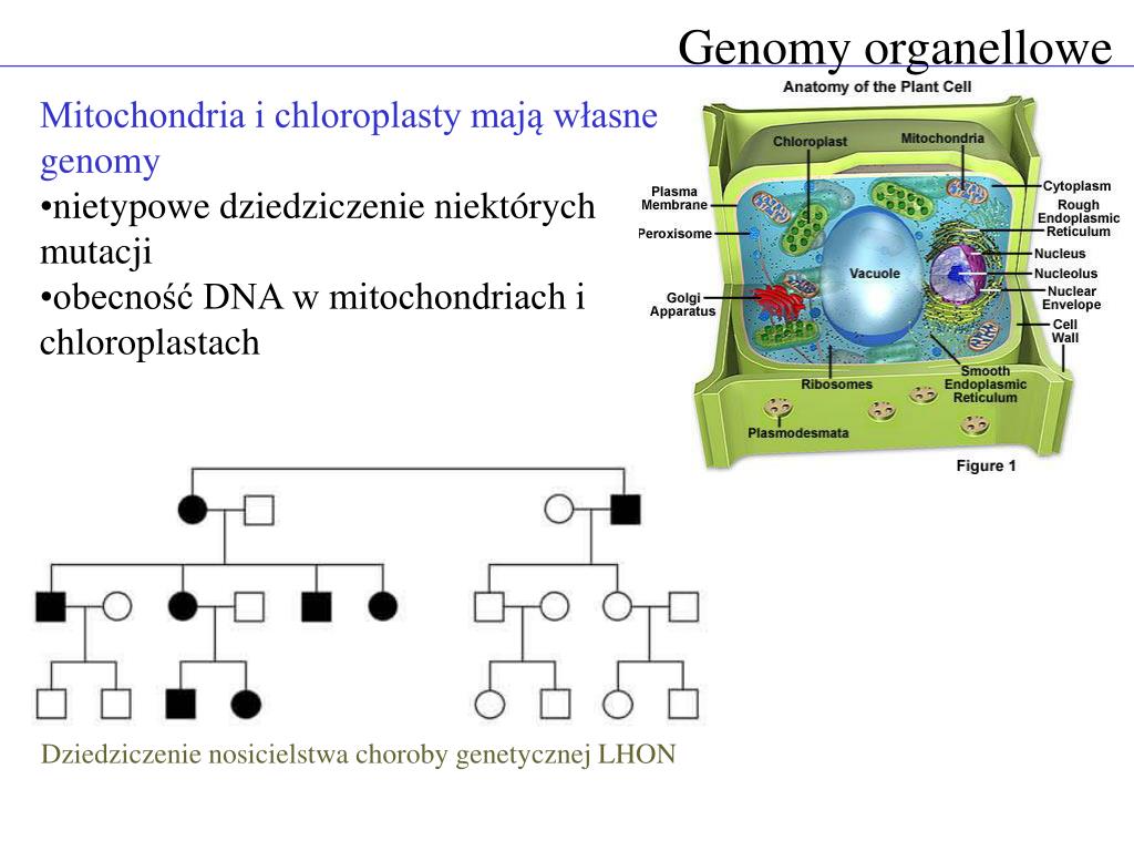 Genomy organellowe • Mitochondria i chloroplasty mają własne genomy • nietypowe dziedziczenie niektórych mutacji • obecność DNA w mitochondriach i chloroplastach Dziedziczenie nosicielstwa choroby genetycznej LHON