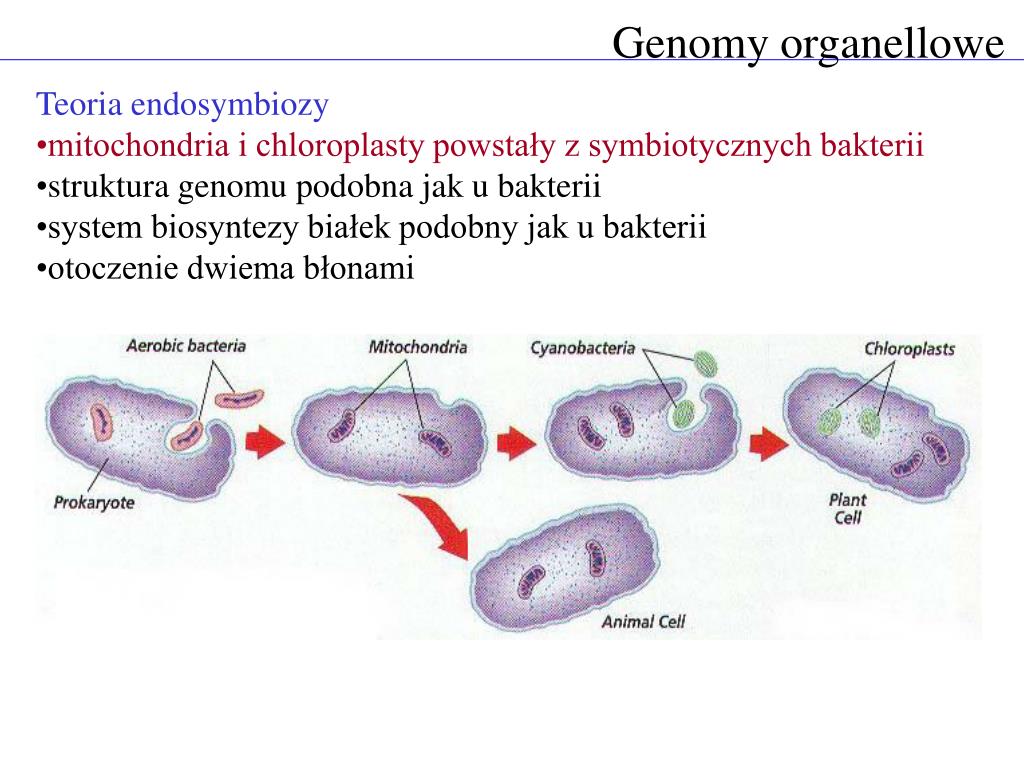 Genomy organellowe • Teoria endosymbiozy • mitochondria i chloroplasty powstały z symbiotycznych bakterii • struktura genomu podobna jak u bakterii • system biosyntezy białek podobny jak u bakterii • otoczenie dwiema błonami