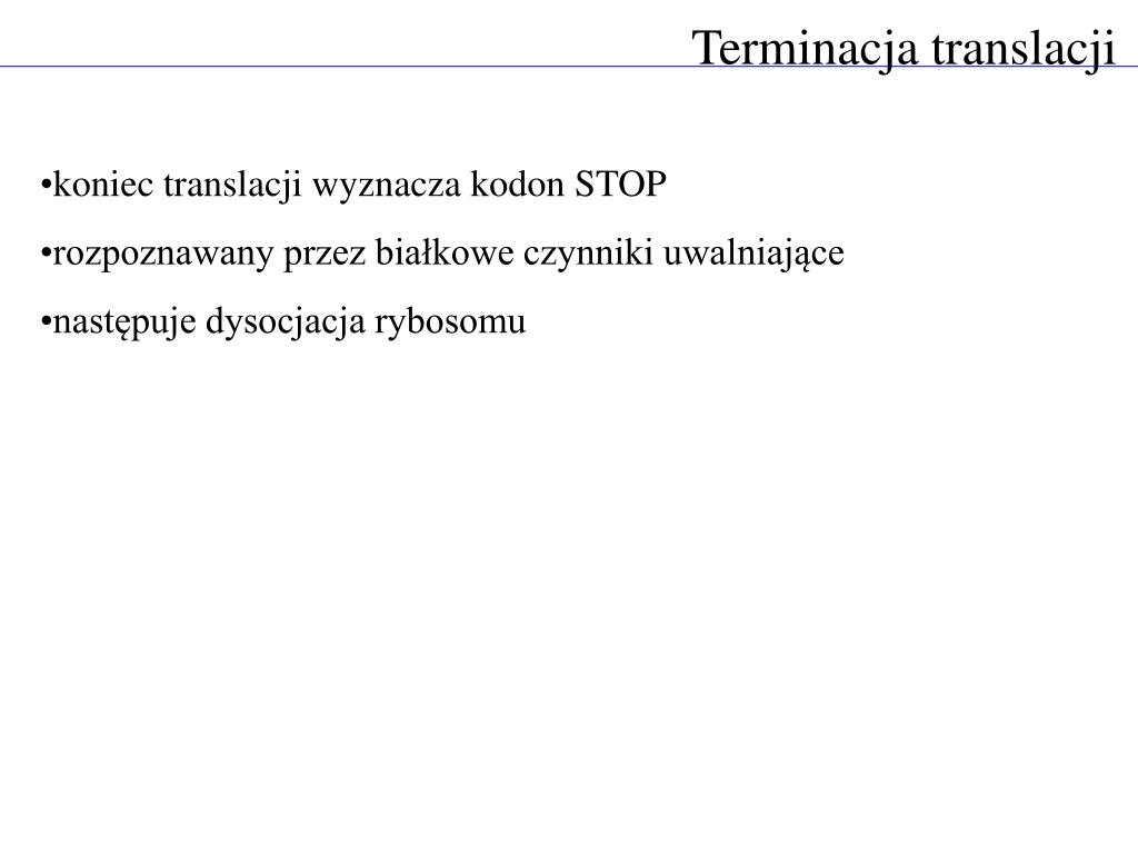 Terminacja translacji • koniec translacji wyznacza kodon STOP • rozpoznawany przez białkowe czynniki uwalniające • następuje dysocjacja rybosomu