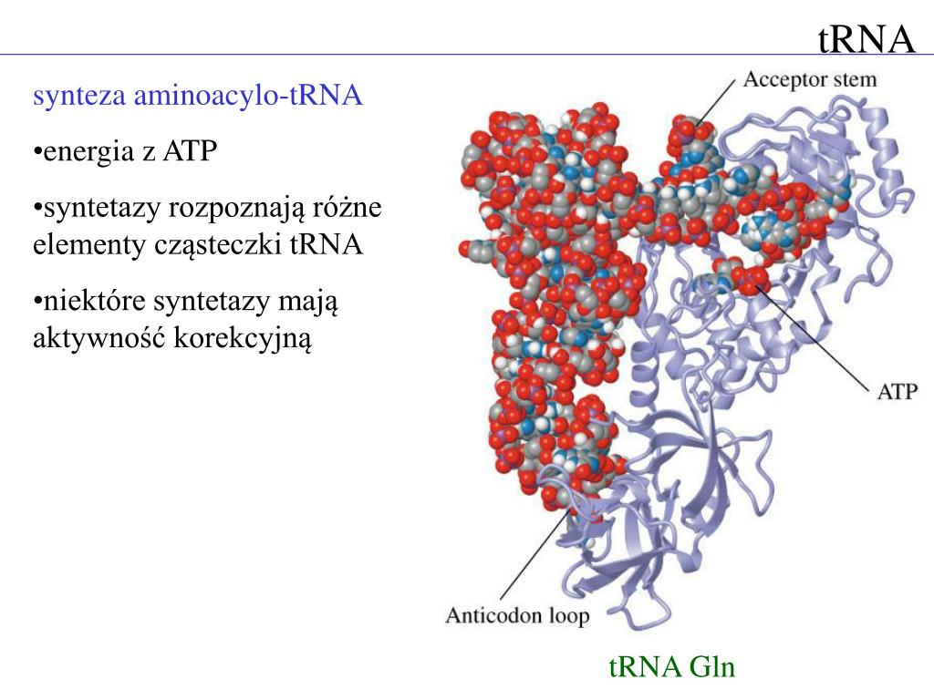 tRNA • synteza aminoacylo-tRNA • energia z ATP • syntetazy rozpoznają różne elementy cząsteczki tRNA • niektóre syntetazy mają aktywność korekcyjną tRNA Gln