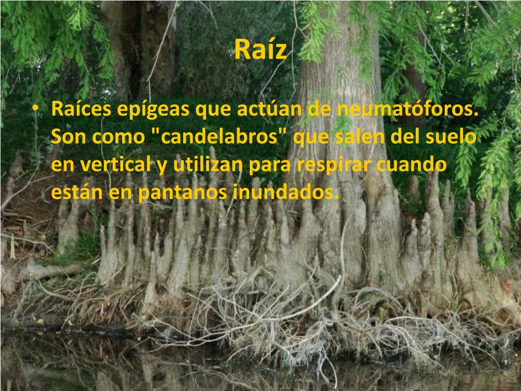 Raíz • Hoy, en estas imágenes podemos observar muchas de ellas, en especial la capacidad de estos árboles de crecer en espacios anegados como pantanos, lo que convierte su madera en especialmente resistente al agua.