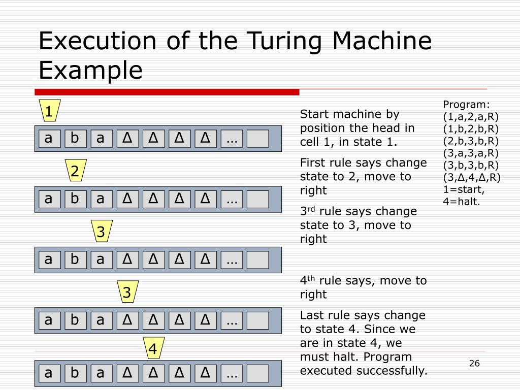 Running of the adding-1-program, add 1 to 1011. 1 (1,0,3,1,R) (1,1,2,0,R) (2,0,3,1,R) (2,1,2,0,R) First pair of numbers are current state and reading, second pair new state and writing, last symbol (R or L) is moving direction. We set up the input tape with the binary number 1011, least significant digit at the leftmost. By 2nd rule, change tape to 0, change state to 2, move to right. By 4th rule, change tape to 0, move to right. By 3rd rule, change 0 to 1, and halt. The result is 1100. 1 1 0 1 Δ Δ Δ … 2 0 1 0 1 Δ Δ Δ … 2 0 0 0 1 Δ Δ Δ … 3 0 0 1 1 Δ Δ Δ …