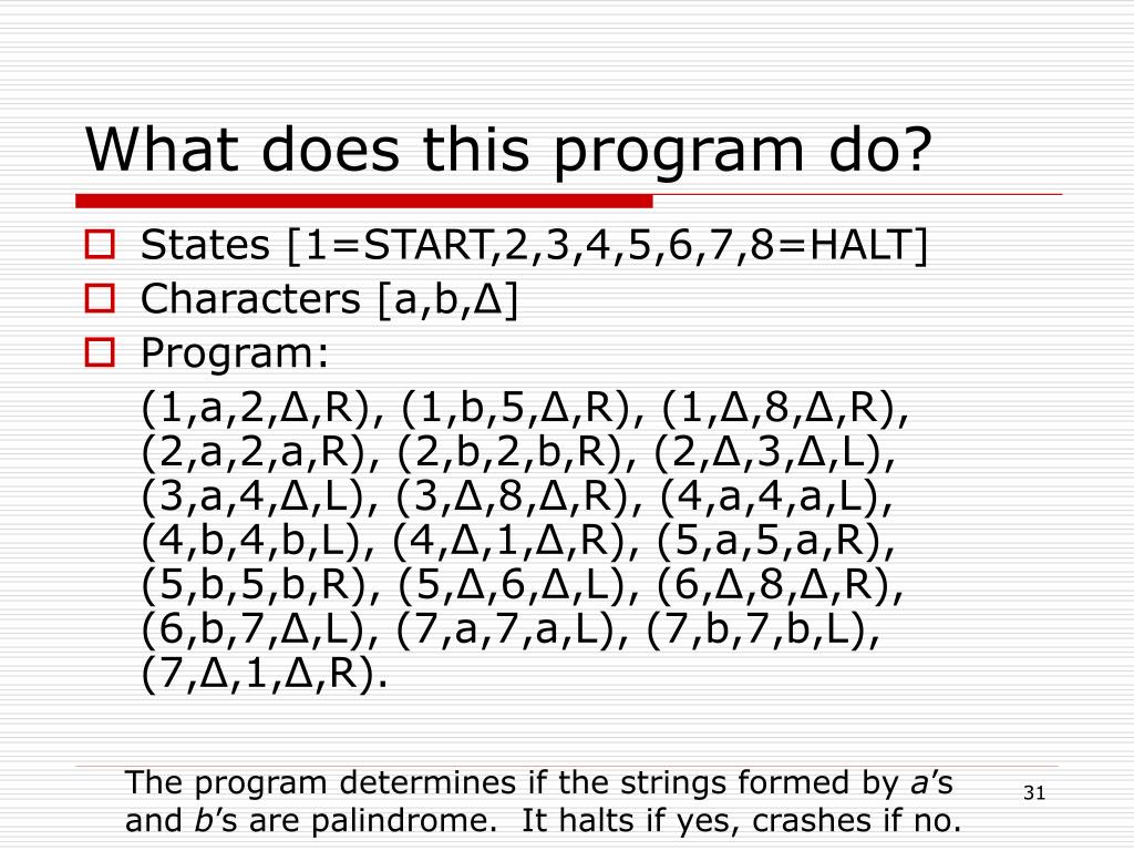 What does this program do? • States [1=START,2,3,4,5,6,7,8=HALT] • Characters [a,b,Δ] • Program: (1,a,2,Δ,R), (1,b,5,Δ,R), (1,Δ,8,Δ,R), (2,a,2,a,R), (2,b,2,b,R), (2,Δ,3,Δ,L), (3,a,4,Δ,L), (3,Δ,8,Δ,R), (4,a,4,a,L), (4,b,4,b,L), (4,Δ,1,Δ,R), (5,a,5,a,R), (5,b,5,b,R), (5,Δ,6,Δ,L), (6,Δ,8,Δ,R), (6,b,7,Δ,L), (7,a,7,a,L), (7,b,7,b,L), (7,Δ,1,Δ,R). The program determines if the strings formed by a’s and b’s are palindrome. It halts if yes, crashes if no.