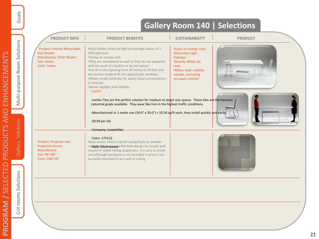 Goals Gallery Room 140 | Selections PRODUCT INFO PRODUCT BENEFITS SUSTAINABILITY PRODUCT Product: Interior Retractable-Duo ShadesManufacture: Polar Shades Size: VariesColor: Varies • Dual Shades allow for light percentage values of 1- 10% openness • Saving on energy cost. • They are mechanical as well so they be can operated with the push of a button or by sun sensor • Can fit in any opening from 30 inches to 20 feet and are custom made to fit the appropriate windows • Allows ample darkness for audio-visual presentations or lectures • Allows daylight and visibility • Saves on energy costs • Eliminates Light Pollution • Directly affects AC costs • Allows clear visibility outside, increasing occupant comfort Multi-purpose Room Solutions CARPET-Jumbo Tiles are the perfect solution for medium to larger size spaces. These tiles are the heaviest industrial grade available. They wear like Iron in the highest traffic conditions. -Manufactured in 1 meter size (39.0" x 39.0") = 10.56 sq/ft each, they install quickly and easily.-$9.99 per tile-Company: icarpettiles-Color: 175122-Style: block weave PROGRAM / SELECTED PRODUCTS AND ENHANCEMENTS Gallery Solutions Product: Projector and Projection Screen Manufacture: Size: 96”x96” Costs: $487.95 Black matte, baked enamel casing features powder coated end caps and a flat back design for simple wall mount or stable ceiling suspension. It is easy to install and although hardware is not included in price it can be easily mounted to any wall or ceiling Crit rooms Solutions