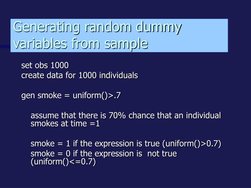 Generating random dummy variables from sample set obs 1000 create data for 1000 individuals gen smoke = uniform()>.7 assume that there is 70% chance that an individual smokes at time =1 smoke = 1 if the expression is true (uniform()>0.7) smoke = 0 if the expression is not true (uniform()<=0.7)