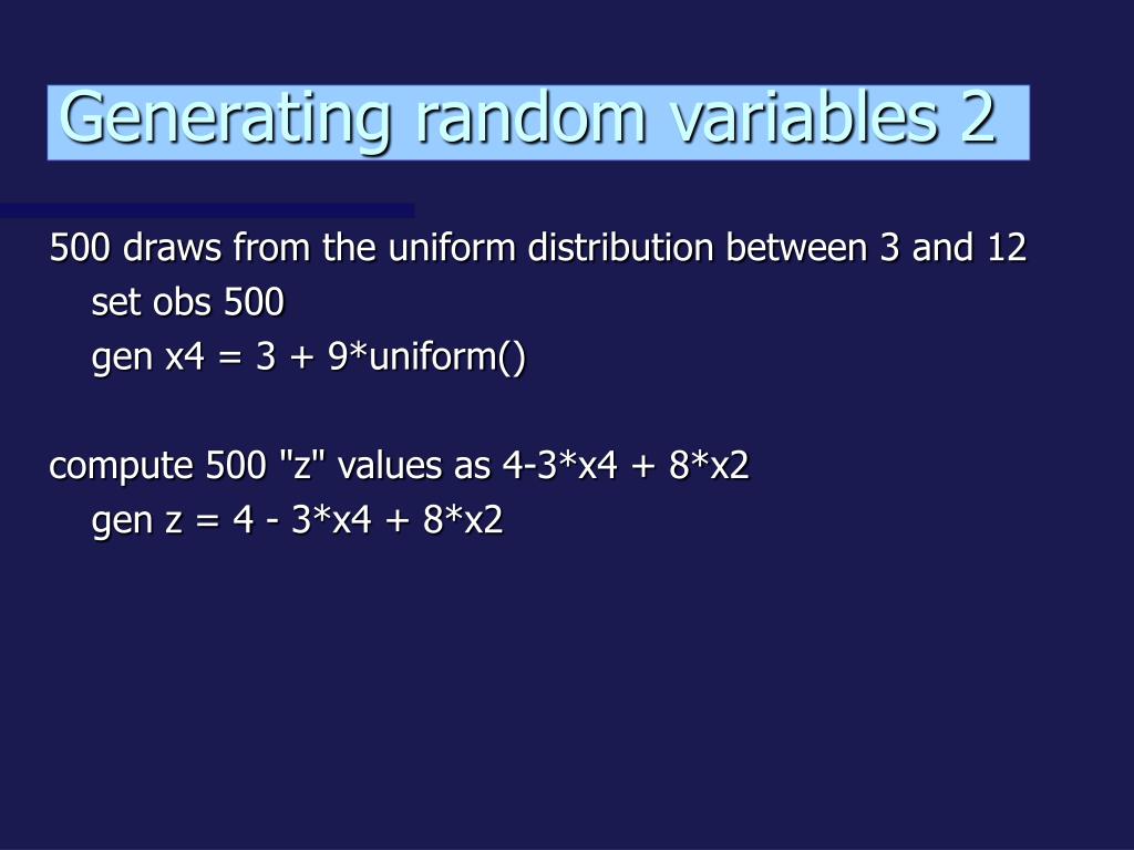 Generating random variables 2 500 draws from the uniform distribution between 3 and 12 set obs 500 gen x4 = 3 + 9*uniform() compute 500 "z" values as 4-3*x4 + 8*x2 gen z = 4 - 3*x4 + 8*x2