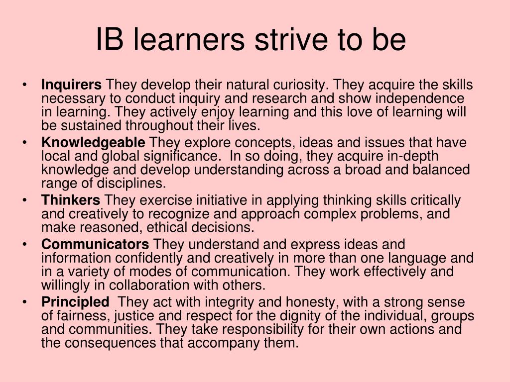 IB learners strive to be • Open-minded They understand and appreciate their own cultures and personal histories, and are open to the perspectives, values and traditions of other individuals and communities. They are accustomed to seeking and evaluating a range of points of view, and are willing to grow from the experience. • Caring They show empathy, compassion and respect towards the needs and feelings of others. They have a personal commitment to service, and act to make a positive difference to the lives of others and to the environment. • Risk-takers They approach unfamiliar situations and uncertainty with courage and forethought, and have the independence of spirit to explore new roles, ideas and strategies. They are brave and articulate in defending their beliefs. • Balanced They understand the importance of intellectual, physical and emotional balance to achieve personal well-being for themselves and others. • Reflective They give thoughtful consideration to their own learning and experience. They are able to assess and understand their strengths and limitations in order to support their learning and personal development.