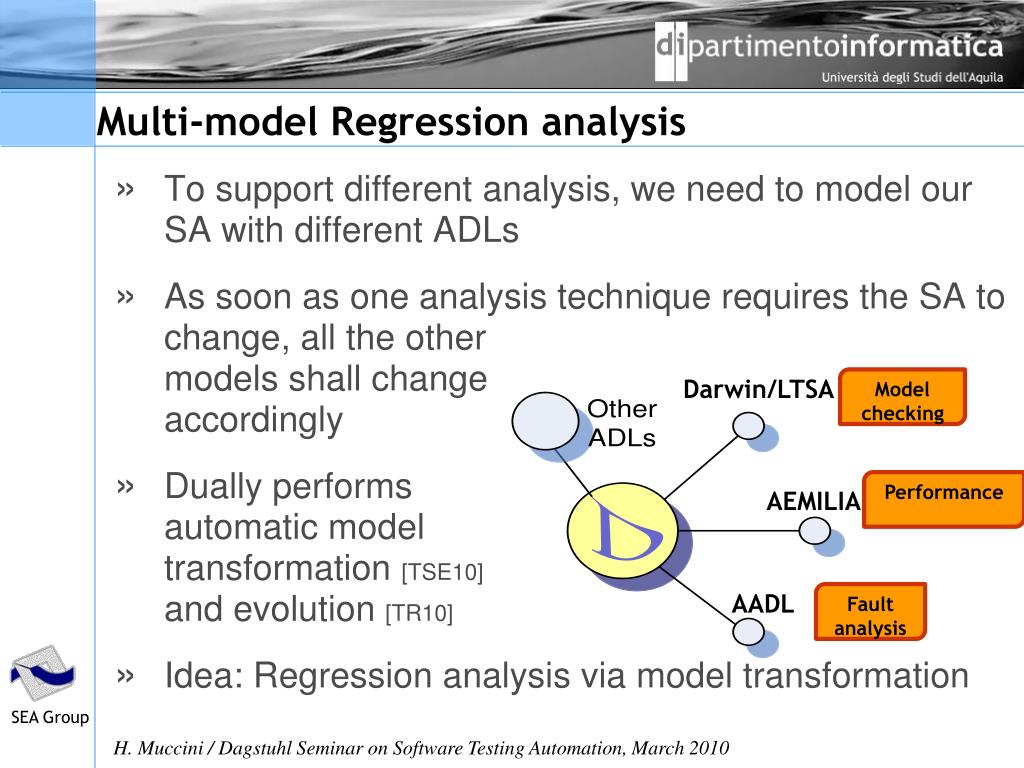 Multi-model Regression analysis • Tosupportdifferentanalysis, weneedtomodelour SA withdifferentADLs • As soonasoneanalysistechniquerequires the SA tochange, all the othermodelsshallchangeaccordingly • Duallyperformsautomaticmodeltransformation[TSE10] and evolution[TR10] • Idea: Regressionanalysis via modeltransformation Darwin/LTSA Modelchecking Performance AEMILIA AADL Fault analysis
