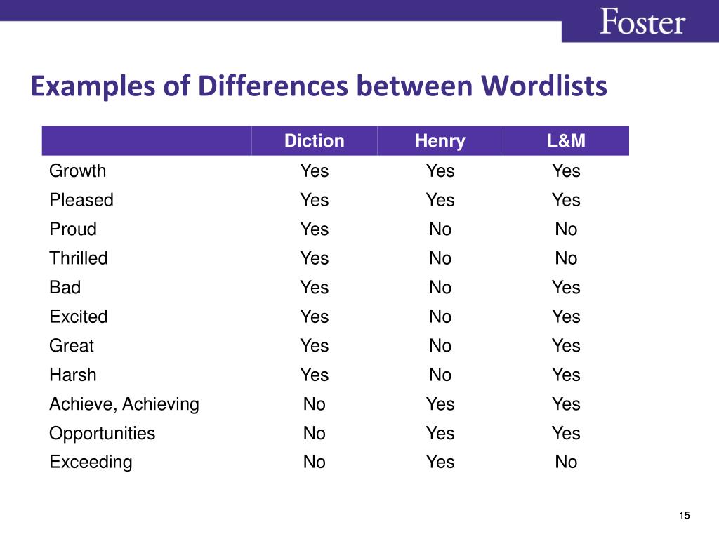 Measures of Tone • Frequency counts of positive vs. negative words • Separate presentation from Q&A • Use only comments in Q&A spoken by specific manager • Three dictionaries used: • TONE_D: Diction (Davis et al. 2010) • TONE_H: Henry (2006, 2008); Henry and Leone (2009) • TONE_LM: Loughran and McDonald (2009) • TONE_i = (positive words – negative words) ÷ total words 14