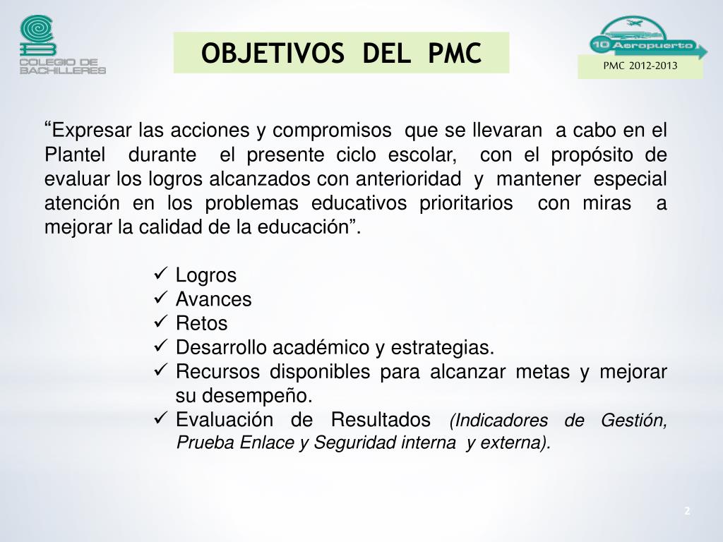 PMC 2012-2013. "PLAN DE MEJORA CONTINUA 2012-2013". Plantel 10 “Aeropuerto”. Clave: 09DCB0017J. Enero 2013. Av. Adolfo L ó pez Mateos y Prolongaci ó n Rio Churubusco S/N, Ampliaci ó n Aviaci ó n Civil, Venustiano Carranza C.P 15740. OBJETIVOS DEL PMC. PMC 2012-2013.