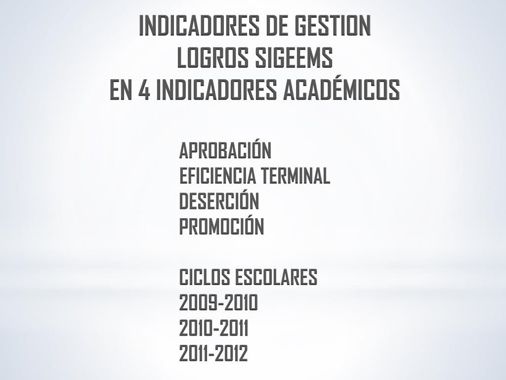 INDICADORES DE GESTION LOGROS SIGEEMS EN 4 INDICADORES ACADÉMICOS APROBACIÓN EFICIENCIA TERMINAL DESERCIÓN PROMOCIÓN CICLOS ESCOLARES 2009-2010 2010-2011 2011-2012