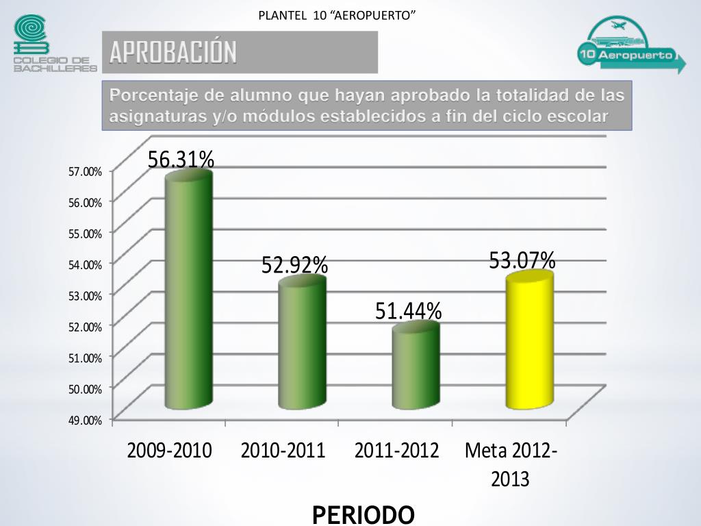 PLANTEL 10 “AEROPUERTO” APROBACIÓN Porcentaje de alumno que hayan aprobado la totalidad de las asignaturas y/o módulos establecidos a fin del ciclo escolar PERIODO