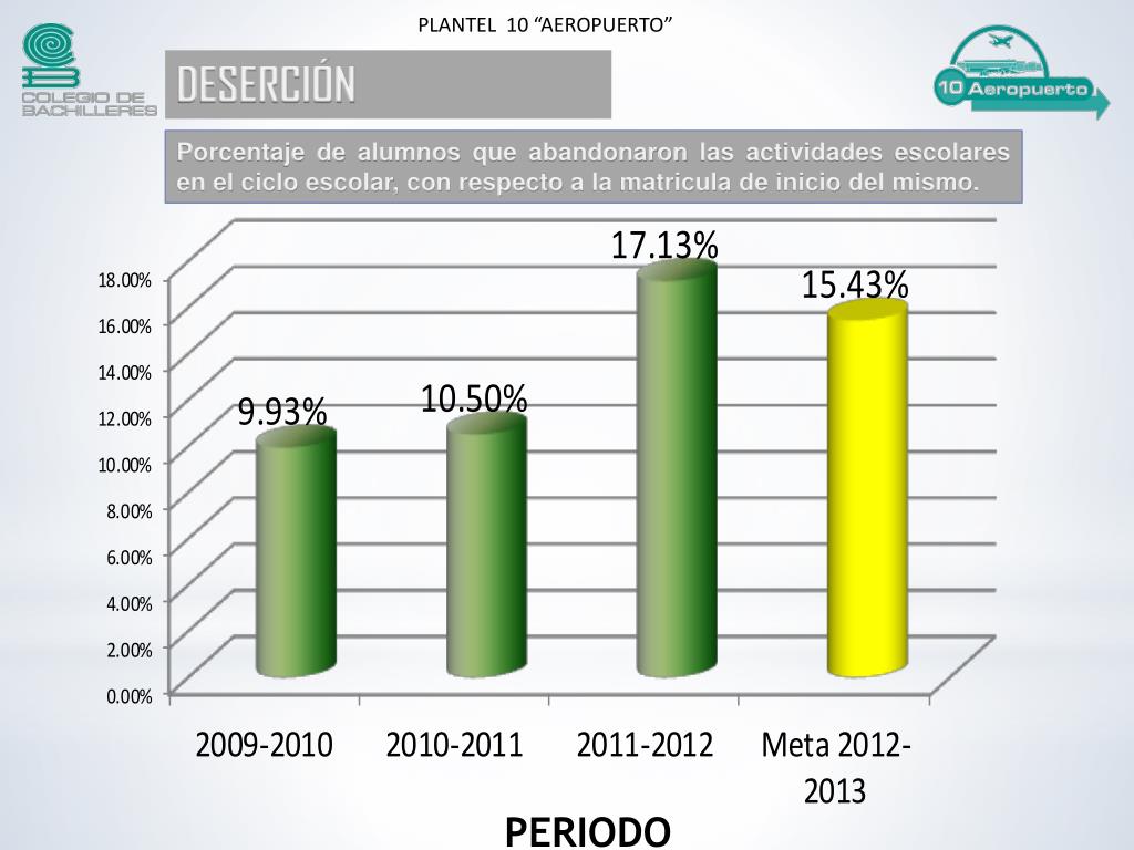 PLANTEL 10 “AEROPUERTO” DESERCIÓN Porcentaje de alumnos que abandonaron las actividades escolares en el ciclo escolar, con respecto a la matricula de inicio del mismo. PERIODO