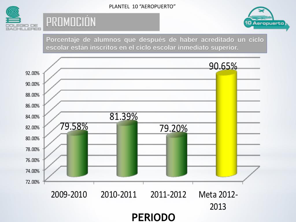 PLANTEL 10 “AEROPUERTO” PROMOCIÓN Porcentaje de alumnos que después de haber acreditado un ciclo escolar están inscritos en el ciclo escolar inmediato superior. PERIODO