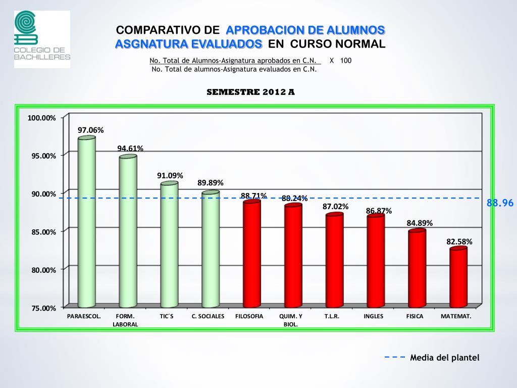 COMPARATIVO DE APROBACION DE ALUMNOS ASGNATURA EVALUADOSEN CURSO NORMAL No. Total de Alumnos-Asignatura aprobados en C.N. X 100 No. Total de alumnos-Asignatura evaluados en C.N. SEMESTRE 2012 A 88.96 Media del plantel