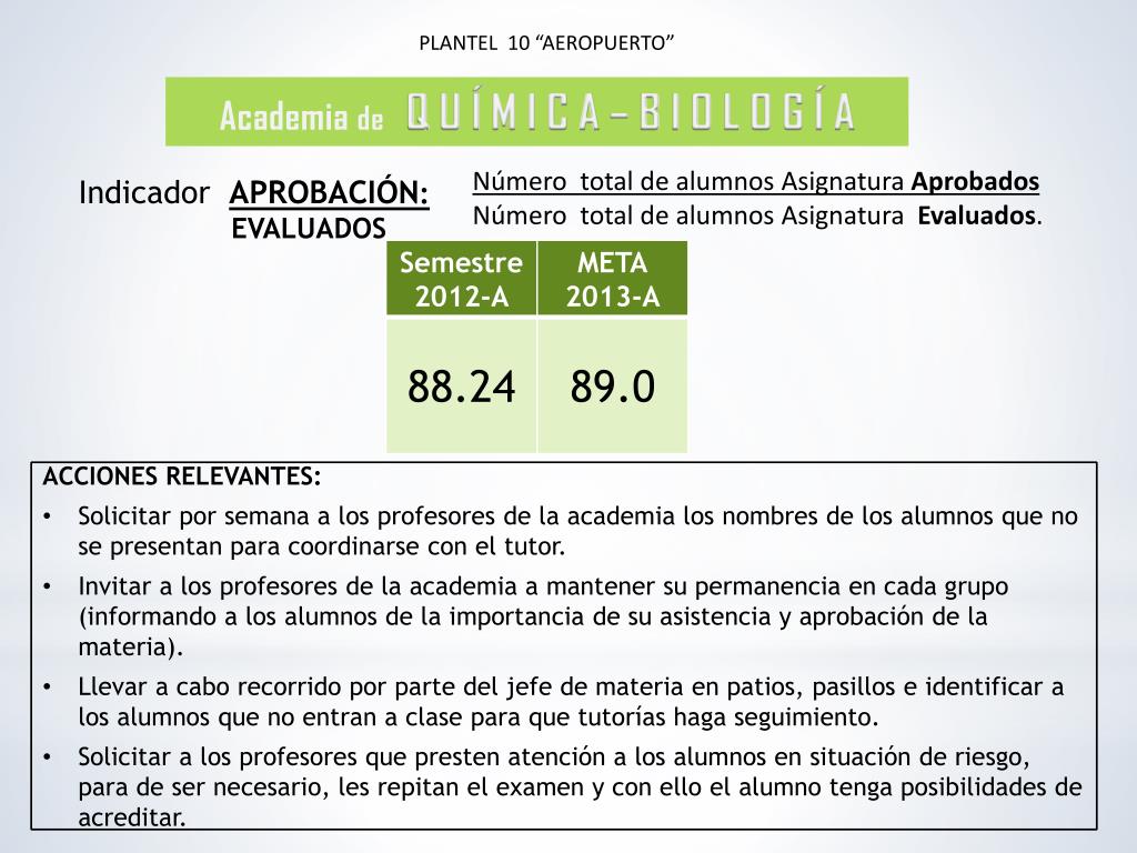 PLANTEL 10 “AEROPUERTO” Academia de Q U Í M I C A – B I O L O G Í A Número total de alumnos Asignatura Aprobados Número total de alumnos Asignatura Evaluados. Indicador APROBACIÓN: EVALUADOS • ACCIONES RELEVANTES: • Solicitar por semana a los profesores de la academia los nombres de los alumnos que no se presentan para coordinarse con el tutor. • Invitar a los profesores de la academia a mantener su permanencia en cada grupo (informando a los alumnos de la importancia de su asistencia y aprobación de la materia). • Llevar a cabo recorrido por parte del jefe de materia en patios, pasillos e identificar a los alumnos que no entran a clase para que tutorías haga seguimiento. • Solicitar a los profesores que presten atención a los alumnos en situación de riesgo, para de ser necesario, les repitan el examen y con ello el alumno tenga posibilidades de acreditar.