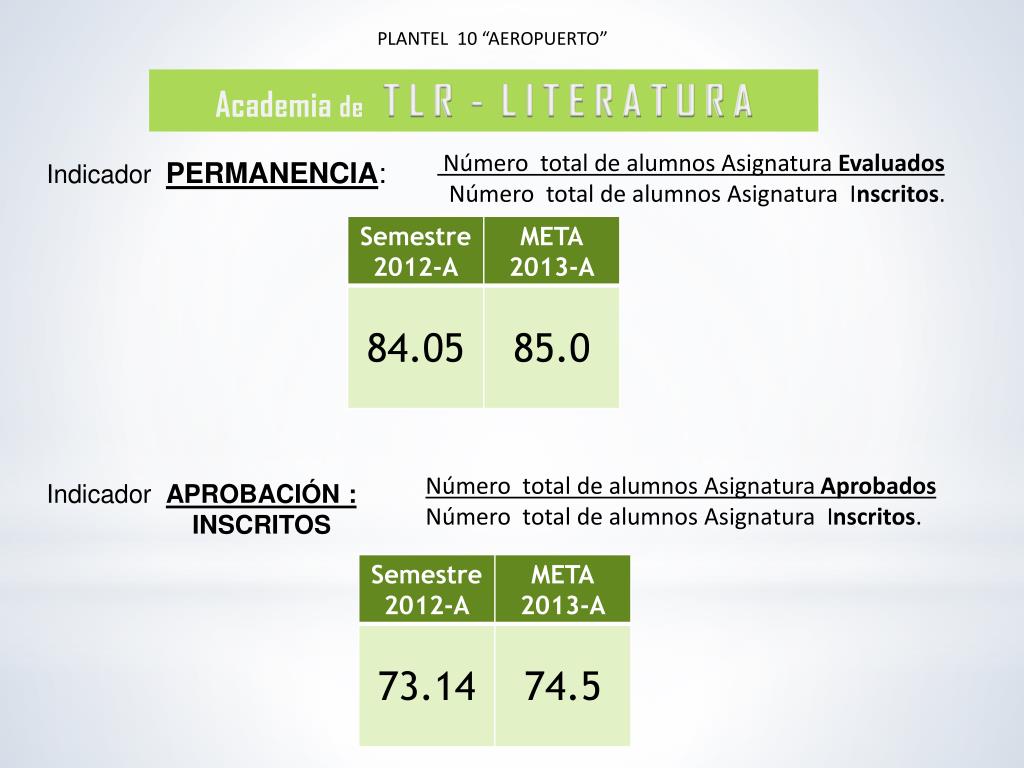 PLANTEL 10 “AEROPUERTO” Academia de T L R - L I T E R A T U R A Número total de alumnos Asignatura Evaluados Número total de alumnos Asignatura Inscritos. Indicador PERMANENCIA: Número total de alumnos Asignatura Aprobados Número total de alumnos Asignatura Inscritos. Indicador APROBACIÓN : INSCRITOS