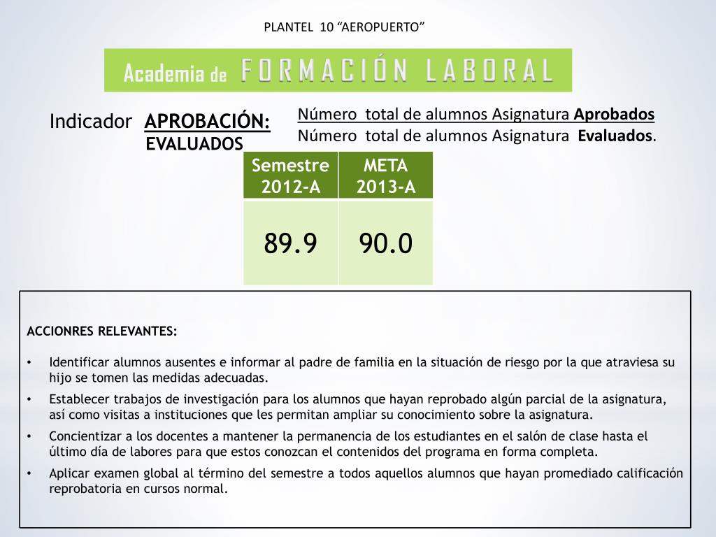 PLANTEL 10 “AEROPUERTO” Academia de F O R M A C I Ó N L A B O R A L Número total de alumnos Asignatura Aprobados Número total de alumnos Asignatura Evaluados. Indicador APROBACIÓN: EVALUADOS • ACCIONRES RELEVANTES: • Identificar alumnos ausentes e informar al padre de familia en la situación de riesgo por la que atraviesa su hijo se tomen las medidas adecuadas. • Establecer trabajos de investigación para los alumnos que hayan reprobado algún parcial de la asignatura, así como visitas a instituciones que les permitan ampliar su conocimiento sobre la asignatura. • Concientizar a los docentes a mantener la permanencia de los estudiantes en el salón de clase hasta el último día de labores para que estos conozcan el contenidos del programa en forma completa. • Aplicar examen global al término del semestre a todos aquellos alumnos que hayan promediado calificación reprobatoria en cursos normal.