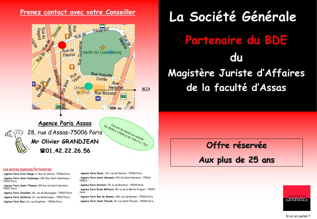 Prenez contact avec votre Conseiller La Société Générale Partenaire du BDE du Magistère Juriste d’Affaires de la faculté d’Assas MJA • Agence Paris Assas • 28, rue d’Assas-75006 Paris • Mr Olivier GRANDJEAN • 01.42.22.26.56 Ouvert du mardi au samedi De 9h00 à 13h00 et de 14h15 à 17h5 Offre réservée Aux plus de 25 ans • Les autres Agences Partenaires: • Agence Paris Croix Rouge: 6, Rue de Sèvres -75006 Paris • Agence Paris Saint Dominique: 106, Rue Saint-Dominique – 75007 Paris • Agence Paris Saint-Thomas: 199 bis, bd Saint-Germain – 75007 Paris • Agence Paris Invalides: 36, rue de Bourgogne – 75007 Paris • Agence Paris Solférino: 21, rue Bellechasse - 75007 Paris • Agence Paris Buci: 63, rue Dauphine – 75006 Paris • -Agence Paris Duroc: 131, rue de Sèvres – 75006 Paris • Agence Paris Saint-Germain: 145, bd Saint-Germain – 75006 PARIS • Agence Paris Breteuil: 78, av de Breteuil – 75015 Paris • Agence Paris Ecole Militaire: 40, av de la Motte-Picquet – 75007 Paris • Agence Paris Rue de Rennes: 148, rue de Rennes – 75006 Paris • Agence Paris Saint-Placide: 15, rue Saint-Placide – 75006 Paris Si on en parlait ?