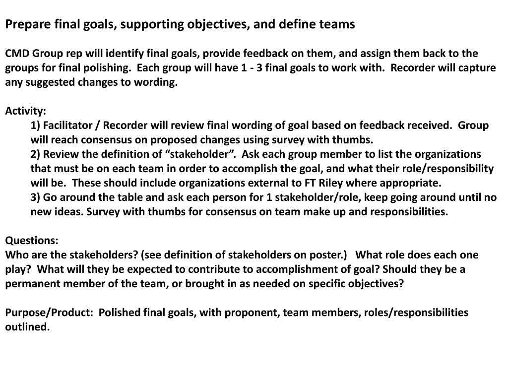 Prepare final goals, supporting objectives, and define teams • CMD Group rep will identify final goals, provide feedback on them, and assign them back to the groups for final polishing. Each group will have 1 - 3 final goals to work with. Recorder will capture any suggested changes to wording. • Activity: • 1) Facilitator / Recorder will review final wording of goal based on feedback received. Group will reach consensus on proposed changes using survey with thumbs. • 2) Review the definition of “stakeholder”. Ask each group member to list the organizations that must be on each team in order to accomplish the goal, and what their role/responsibility will be. These should include organizations external to FT Riley where appropriate. • 3) Go around the table and ask each person for 1 stakeholder/role, keep going around until no new ideas. Survey with thumbs for consensus on team make up and responsibilities. • Questions: • Who are the stakeholders? (see definition of stakeholders on poster.) What role does each one play? What will they be expected to contribute to accomplishment of goal? Should they be a permanent member of the team, or brought in as needed on specific objectives? • Purpose/Product: Polished final goals, with proponent, team members, roles/responsibilities outlined.