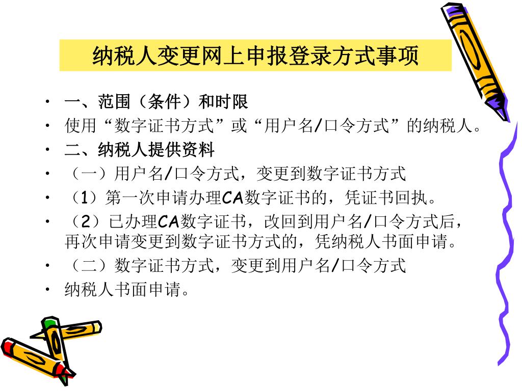 纳税人变更网上申报登录方式事项 • 一、范围(条件)和时限 • 使用“数字证书方式”或“用户名/口令方式”的纳税人。 • 二、纳税人提供资料 • (一)用户名/口令方式,变更到数字证书方式 • (1)第一次申请办理CA数字证书的,凭证书回执。 • (2)已办理CA数字证书,改回到用户名/口令方式后,再次申请变更到数字证书方式的,凭纳税人书面申请。 • (二)数字证书方式,变更到用户名/口令方式 • 纳税人书面申请。