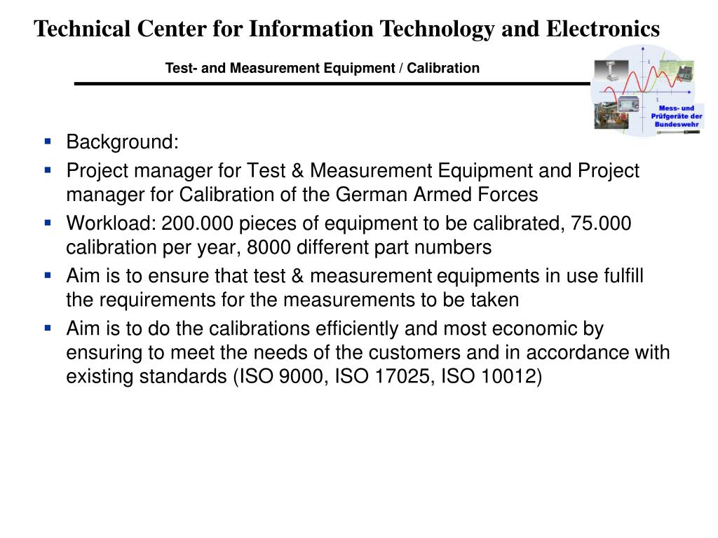 Background: • Project manager for Test & Measurement Equipment and Project manager for Calibration of the German Armed Forces • Workload: 200.000 pieces of equipment to be calibrated, 75.000 calibration per year, 8000 different part numbers • Aim is to ensure that test & measurement equipments in use fulfill the requirements for the measurements to be taken • Aim is to do the calibrations efficiently and most economic by ensuring to meet the needs of the customers and in accordance with existing standards (ISO 9000, ISO 17025, ISO 10012)