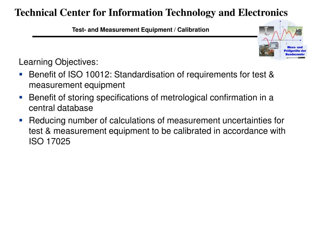 Learning Objectives: • Benefitof ISO 10012: Standardisation ofrequirementsfortest & measurementequipment • Benefitofstoringspecificationsofmetrologicalconfirmation in a centraldatabase • Reducingnumberofcalculationsofmeasurementuncertaintiesfortest & measurementequipmenttobecalibrated in accordancewith ISO 17025