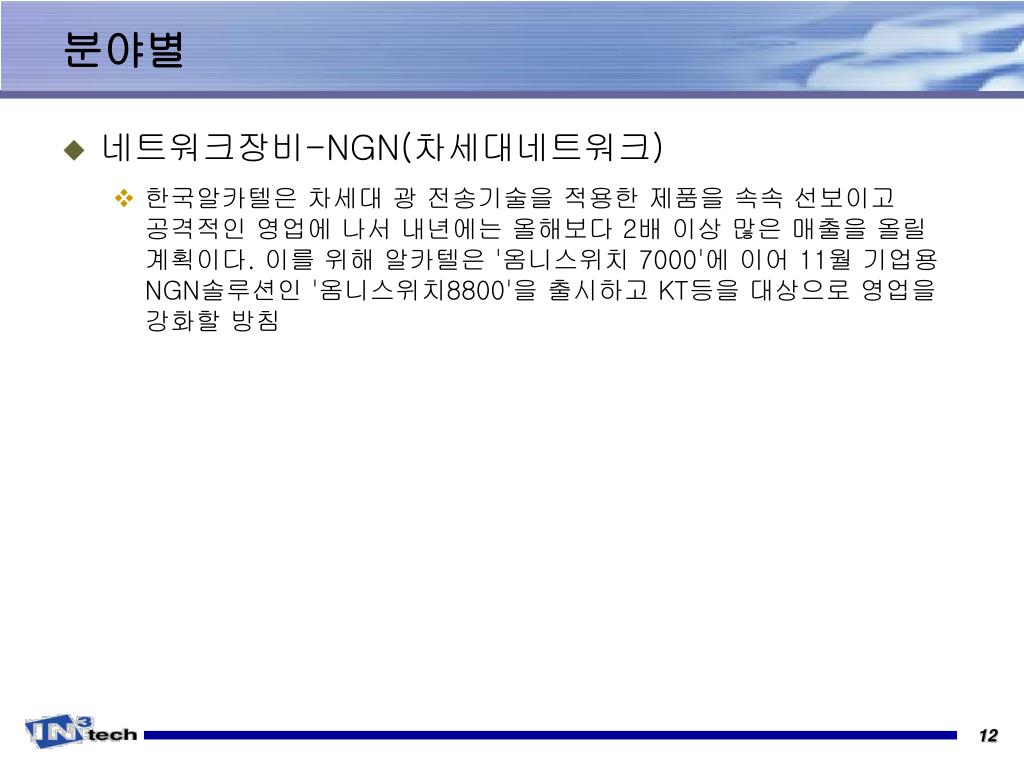 분야별 • 네트워크장비-NGN(차세대네트워크) • 한국알카텔은 차세대 광 전송기술을 적용한 제품을 속속 선보이고 공격적인 영업에 나서 내년에는 올해보다 2배 이상 많은 매출을 올릴 계획이다. 이를 위해 알카텔은 '옴니스위치 7000'에 이어 11월 기업용 NGN솔루션인 '옴니스위치8800'을 출시하고 KT등을 대상으로 영업을 강화할 방침