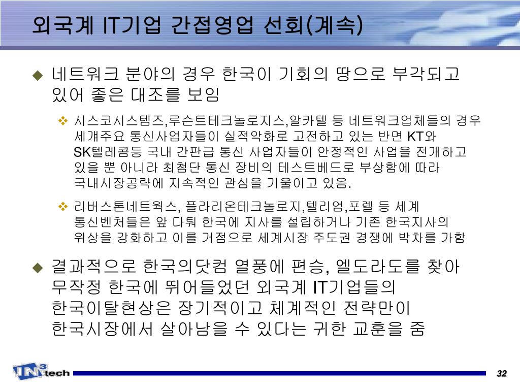 외국계 IT기업 간접영업 선회(계속) • 네트워크 분야의 경우 한국이 기회의 땅으로 부각되고 있어 좋은 대조를 보임 • 시스코시스템즈,루슨트테크놀로지스,알카텔 등 네트워크업체들의 경우 세걔주요 통신사업자들이 실적악화로 고전하고 있는 반면 KT와 SK텔레콤등 국내 간판급 통신 사업자들이 안정적인 사업을 전개하고 있을 뿐 아니라 최첨단 통신 장비의 테스트베드로 부상함에 따라 국내시장공략에 지속적인 관심을 기울이고 있음. • 리버스톤네트웍스, 플라리온테크놀로지,텔리엄,포렐 등 세계 통신벤처들은 앞 다퉈 한국에 지사를 설립하거나 기존 한국지사의 위상을 강화하고 이를 거점으로 세계시장 주도권 경쟁에 박차를 가함 • 결과적으로 한국의닷컴 열풍에 편승, 엘도라도를 찾아 무작정 한국에 뛰어들었던 외국계 IT기업들의 한국이탈현상은 장기적이고 체계적인 전략만이 한국시장에서 살아남을 수 있다는 귀한 교훈을 줌