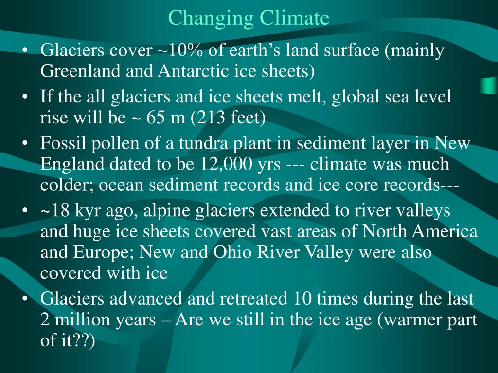 Changing Climate • Glaciers cover ~10% of earth’s land surface (mainly Greenland and Antarctic ice sheets) • If the all glaciers and ice sheets melt, global sea level rise will be ~ 65 m (213 feet) • Fossil pollen of a tundra plant in sediment layer in New England dated to be 12,000 yrs --- climate was much colder; ocean sediment records and ice core records--- • ~18 kyr ago, alpine glaciers extended to river valleys and huge ice sheets covered vast areas of North America and Europe; New and Ohio River Valley were also covered with ice • Glaciers advanced and retreated 10 times during the last 2 million years – Are we still in the ice age (warmer part of it??)