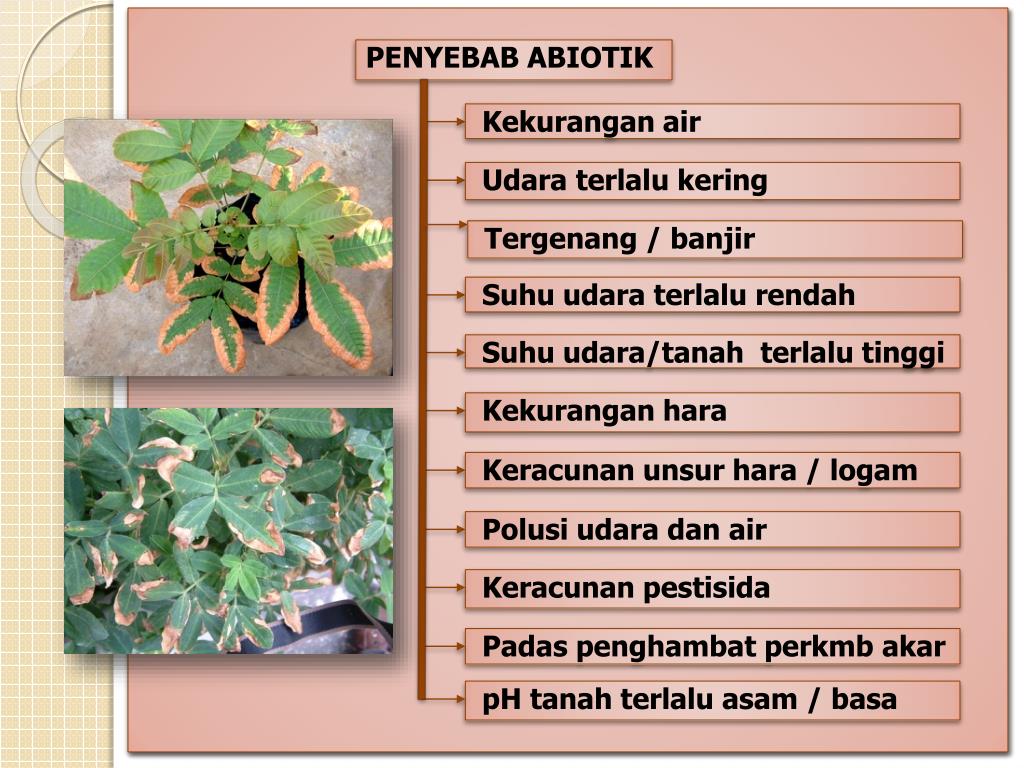 PENYEBAB ABIOTIK Kekurangan air Udara terlalu kering Suhu udara terlalu rendah Suhu udara/tanah terlalu tinggi Kekurangan hara Keracunan unsur hara / logam Polusi udara dan air Keracunan pestisida Padas penghambat perkmb akar pH tanah terlalu asam / basa Tergenang / banjir