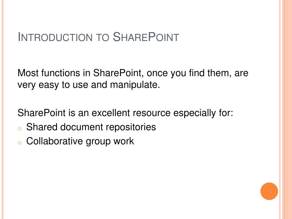 Introduction to SharePoint Most functions in SharePoint, once you find them, are very easy to use and manipulate. SharePoint is an excellent resource especially for: • Shared document repositories • Collaborative group work