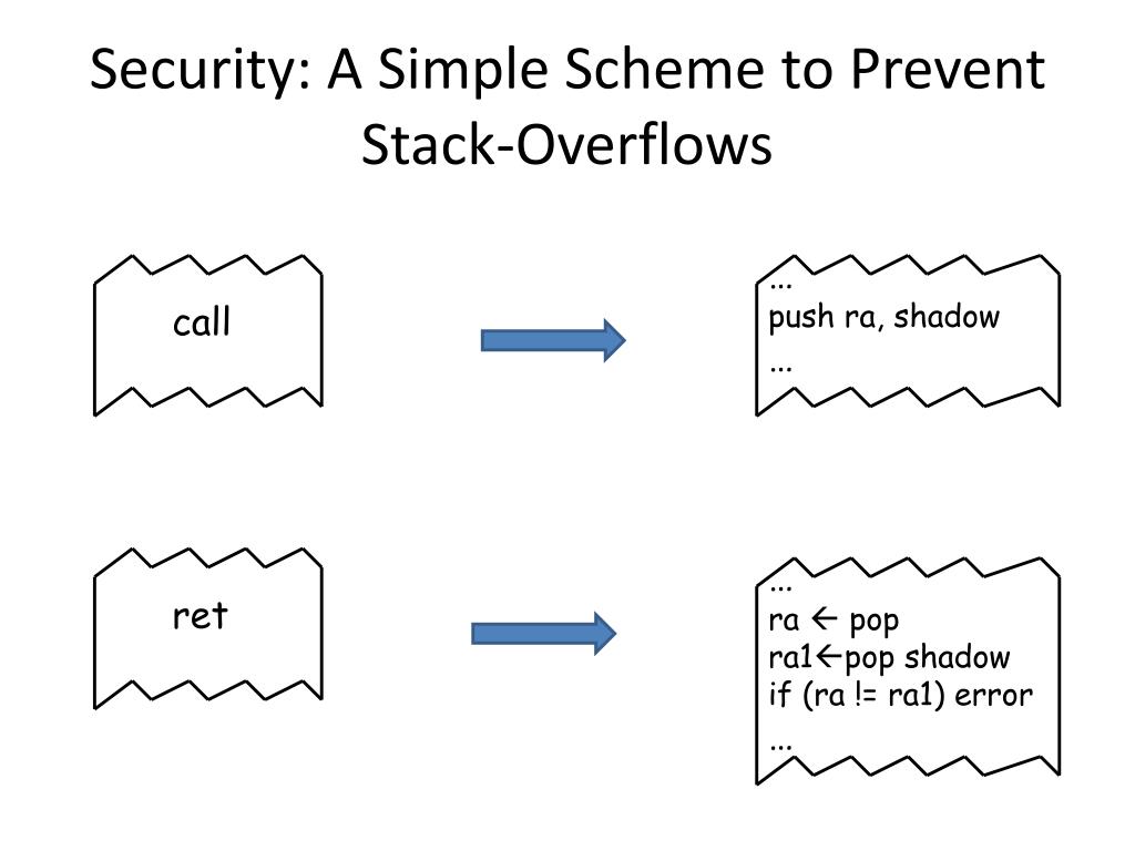 Security: A Simple Scheme to PreventStack-Overflows … push ra, shadow … call … ra pop ra1pop shadow if (ra != ra1) error … ret