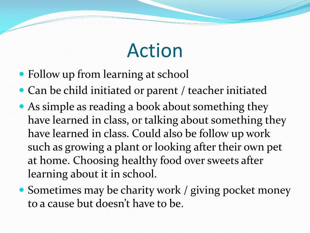 Action • Follow up from learning at school • Can be child initiated or parent / teacher initiated • As simple as reading a book about something they have learned in class, or talking about something they have learned in class. Could also be follow up work such as growing a plant or looking after their own pet at home. Choosing healthy food over sweets after learning about it in school. • Sometimes may be charity work / giving pocket money to a cause but doesn’t have to be.